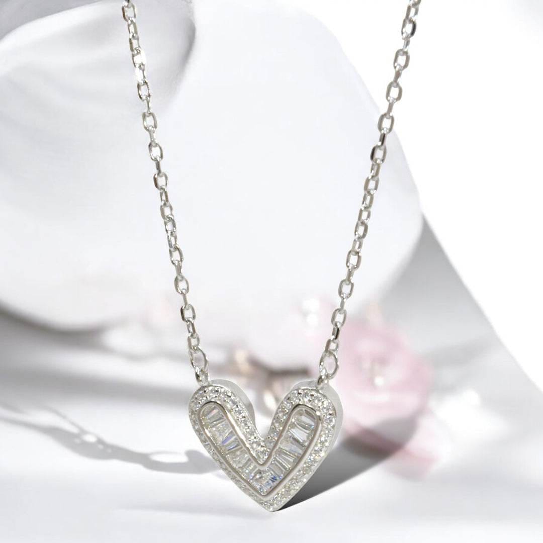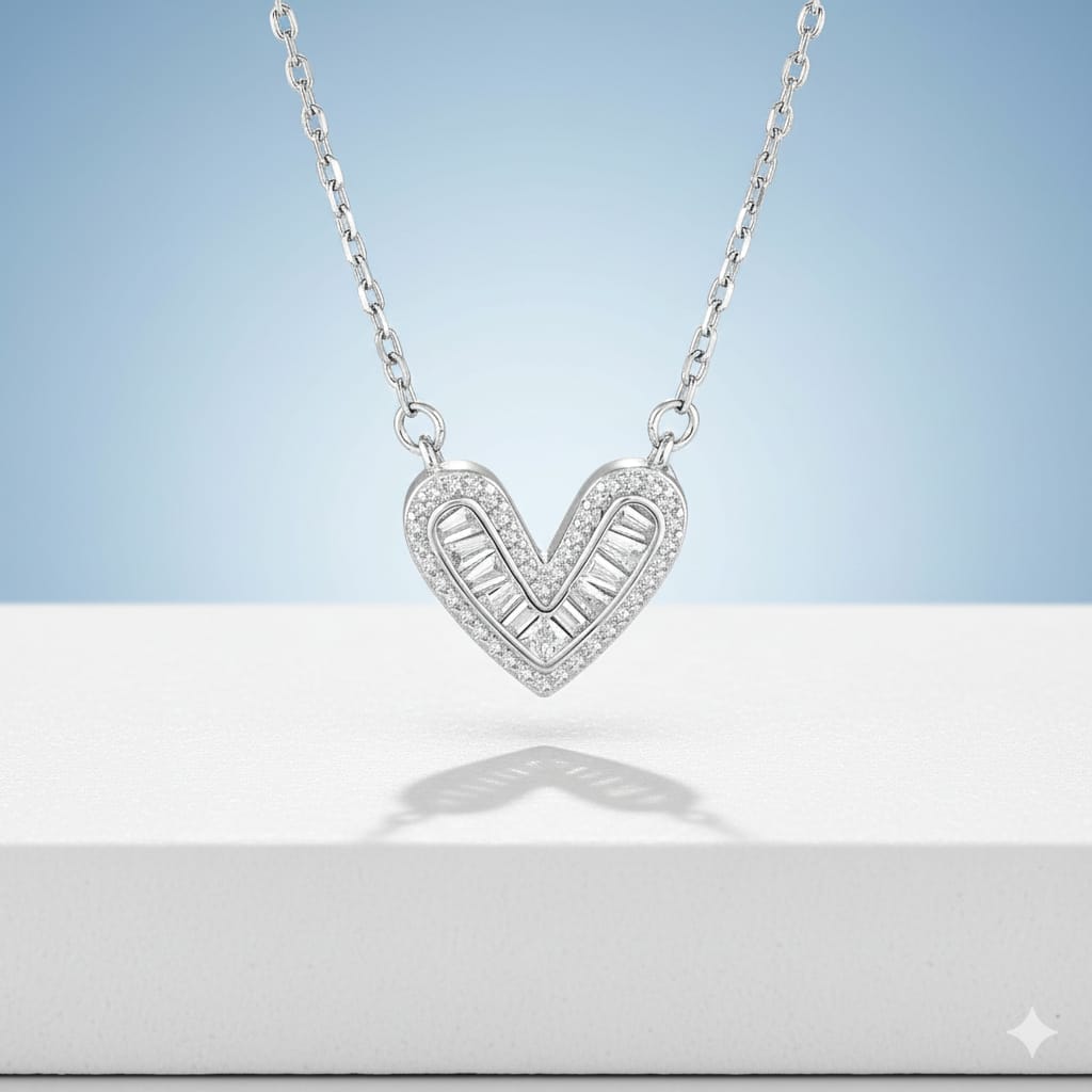 Elevate your jewelry collection with this sophisticated heart pendant necklace, featuring a stunning combination of round brilliant-cut and elegant baguette-cut cubic zirconia stones. The heart centerpiece showcases premium simulated diamonds that capture and reflect light with exceptional brilliance, rivaling the sparkle of genuine gemstones. Crafted with meticulous attention to detail, this piece offers timeless elegance at an accessible price point. Perfect for everyday wear or special occasions, the versatile design complements both casual and formal ensembles. The necklace combines classic romance with contemporary styling, making it an essential addition to any jewelry wardrobe.